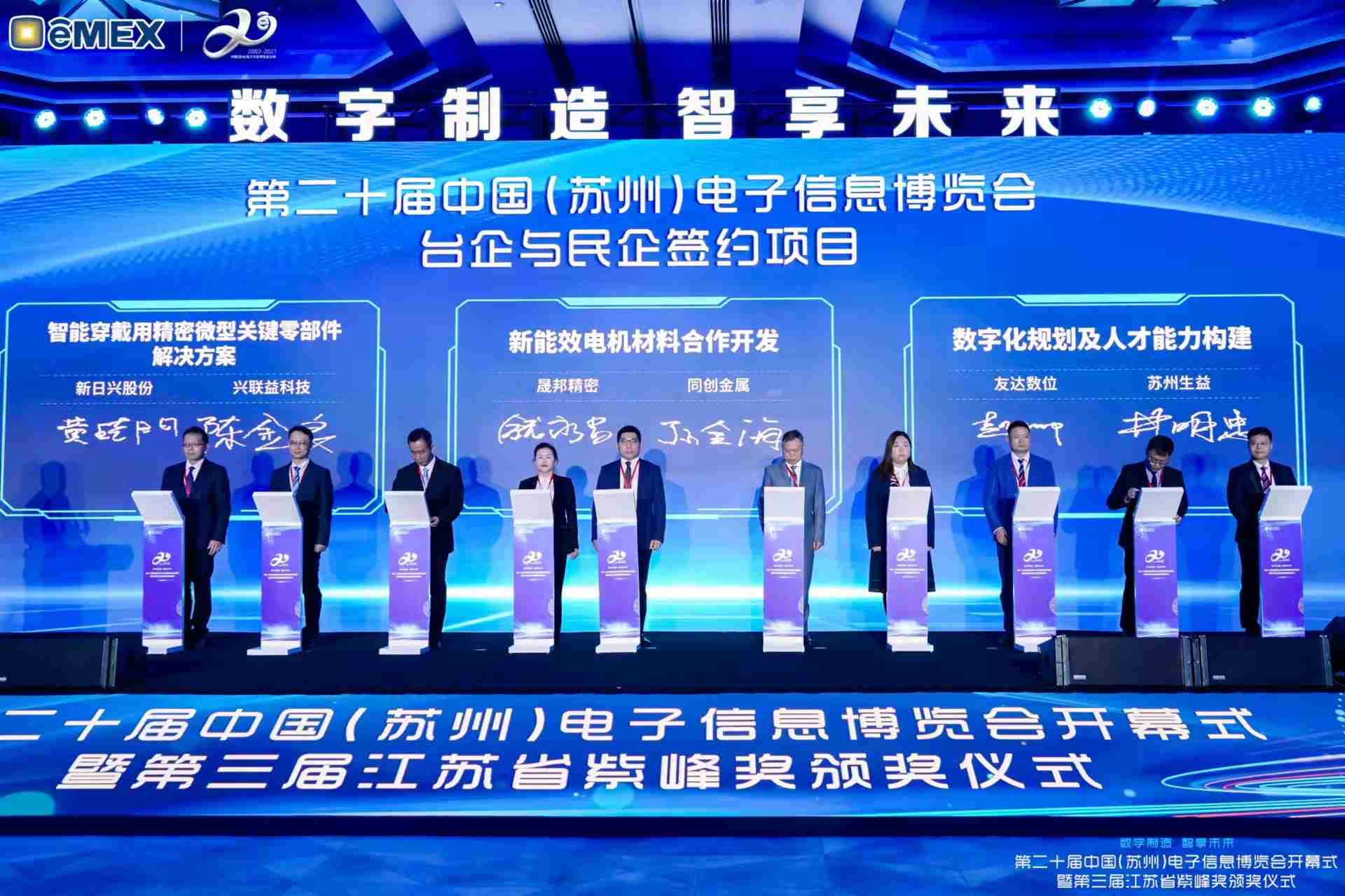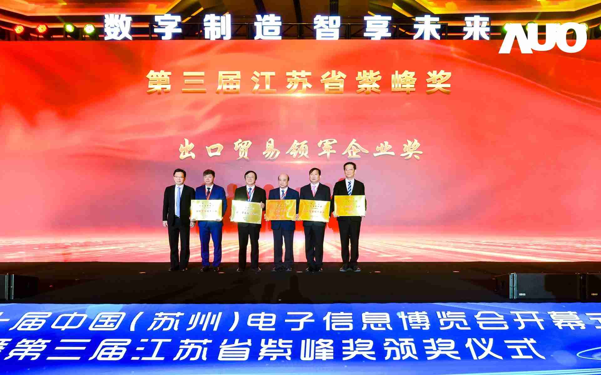 电博会开幕式当天也是第三届江苏省紫峰奖颁奖仪式,,,,省台办、、、、工信厅、、、、商务厅、、、、苏州市相关领导均出席并颁奖。。该奖项为表彰对江苏高质量发展做出积极贡献的在苏企业,,,,由江苏省政府专门设立。。。万利光电 (苏州) 总经理郭振明代表上台领奖,,这也是万利苏州连续三次蝉联紫峰奖 出口贸易领军企业奖。。。万利数位总经理赵丽娜女士,,也参与本次开幕式,,上台为本地化赋能签署战略合作协议,,,,将优质服务资源集合、、下沉到更多细分行业,,,为更多地区的制造企业提供数字化转型服务。。