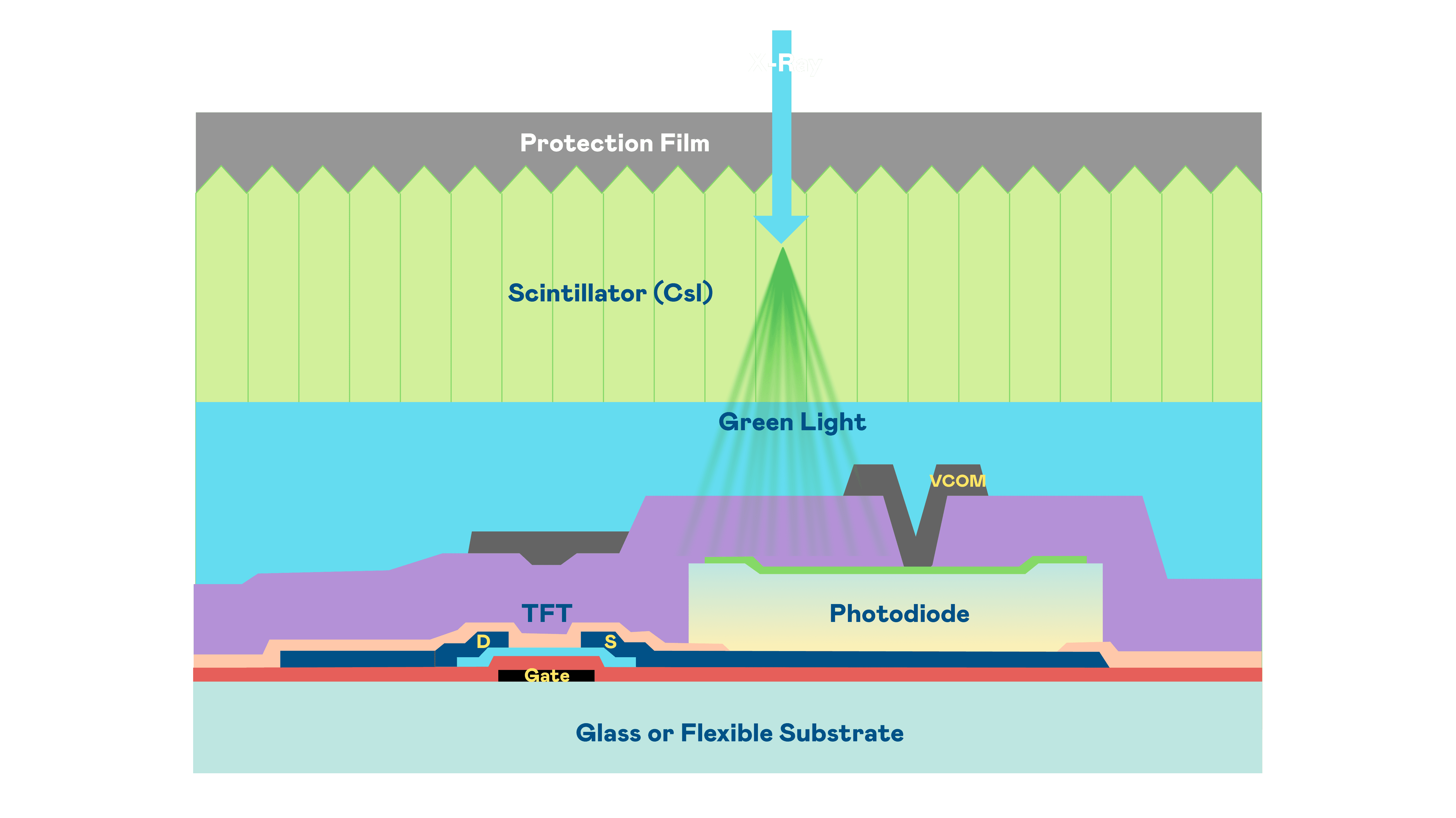 万利的X光影像感测阵列使用薄膜电晶体 (TFT) 作为每个像素的读取开关,,,,搭配光电二极体(Photodiode)的光电转换元件,,用以感测X光影像讯号。。
